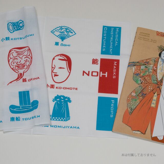能面や楽器、作り物、楽器をデザインした檜書店オリジナルの手ぬぐいです。